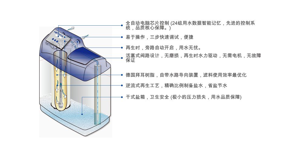 e、濾料品質(zhì)頂級(jí)、軟化效果的保障,國(guó)際先進(jìn)的濾料選擇,樹(shù)脂采用德國(guó)拜耳樹(shù)脂,軟水品質(zhì)的保證。
