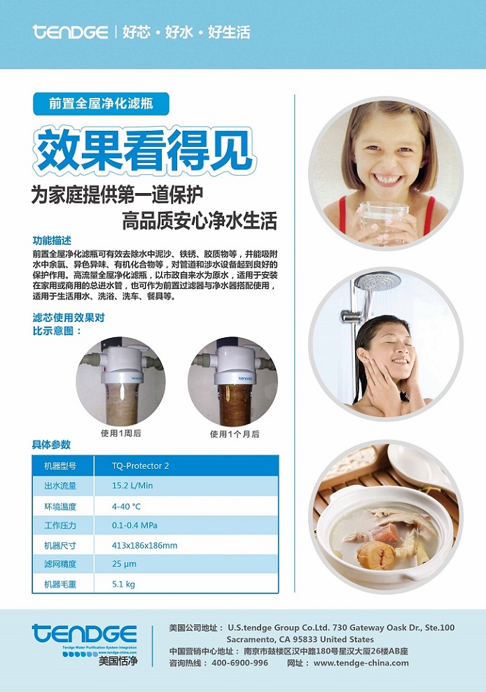 恬凈前置全屋凈化濾瓶TQ-P2能有效去除水中的懸浮物、鐵銹、顆粒雜質(zhì)、余氯、異色異味,它采用FDA食品級材質(zhì),高精度過濾濾芯,體積小巧,安裝方便。恬凈前置全屋凈化濾瓶TQ-P2能承受高水壓,流量超大,智能濾芯提醒功能,節(jié)能環(huán)保。