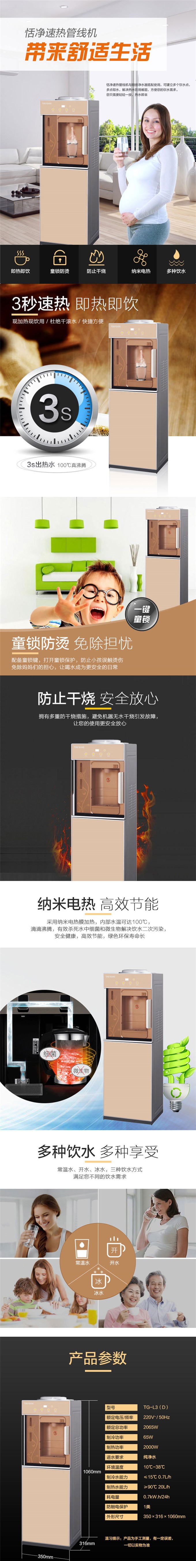 恬凈速熱管線飲水機TG-L3(D),采用納米電熱膜加熱技術(shù),有效殺死水中的細菌微生物,防治二次污染。3秒速熱,隨時可喝上熱水。恬凈速熱管線飲水機TG-L3(D)自帶防干燒系統(tǒng)與童鎖,安全省心。